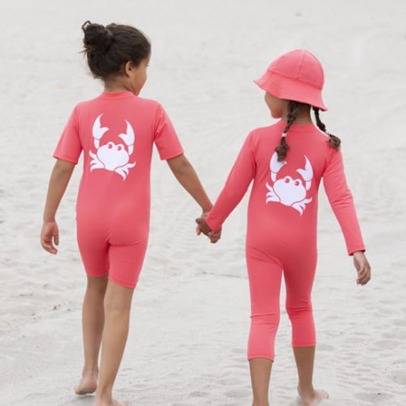 Schöner, qualitativ hochwertiger UV Anzug der Marke Petit Crabe in der Farbe Nektarine. Auf der Rückseite ist eine fröhliche Krabbe abgebildet