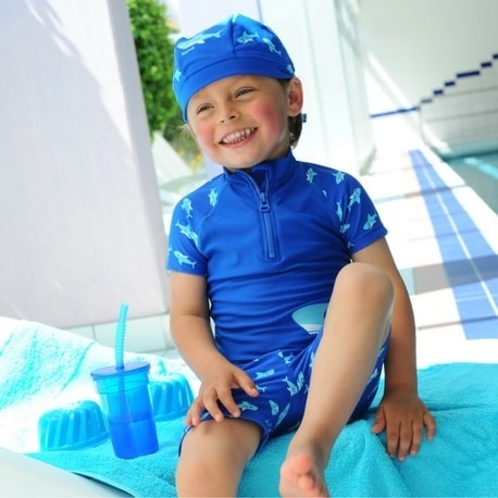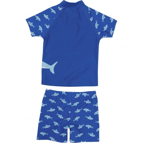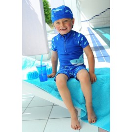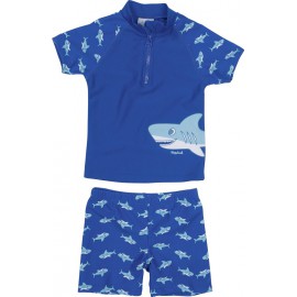 Super cooles blaues Shirt mit dazu passender Badehose mit dem Thema Hai. An den Seiten und auf den Schultern finden Sie Hai-Abbildungen. Um das Set komplett zu machen, gibt es mit dem Thema Hai auch Badeschuhe, Sonnenhüte und Ponchos.